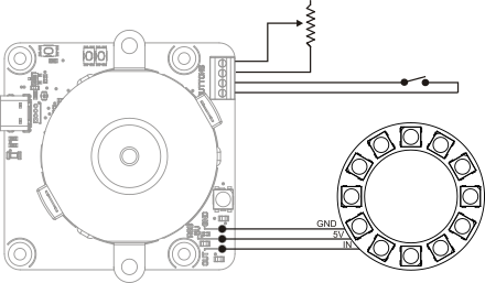 Le module Yocto-MaxiBuzzer-C dispose de deux entrées auxquelles il est possible de connecter tout type de capteur résistif tel qu'un interrupteur, bouton poussoir, potentiomètres, photo-diode, contact reed, etc. Vous pouvez utiliser n'importe quelle valeur de potentiomètre entre 1KΩ et 200KΩ