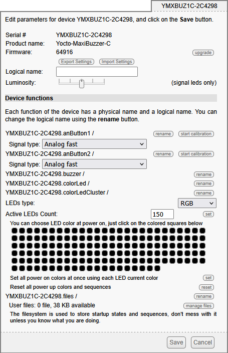 Cinq fonctions sont disponibles sur le Yocto-MaxiBuzzer-C: un Buzzer, qui correspond au buzzer embarqué sur le module, une ColorLed qui permet de manipuler la LED RGB directement sur le module, un ColorLedCluster qui permet de manipuler les LEDs externes, et deux AnButton qui correspondent aux entrées analogiques.