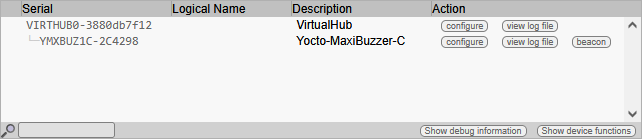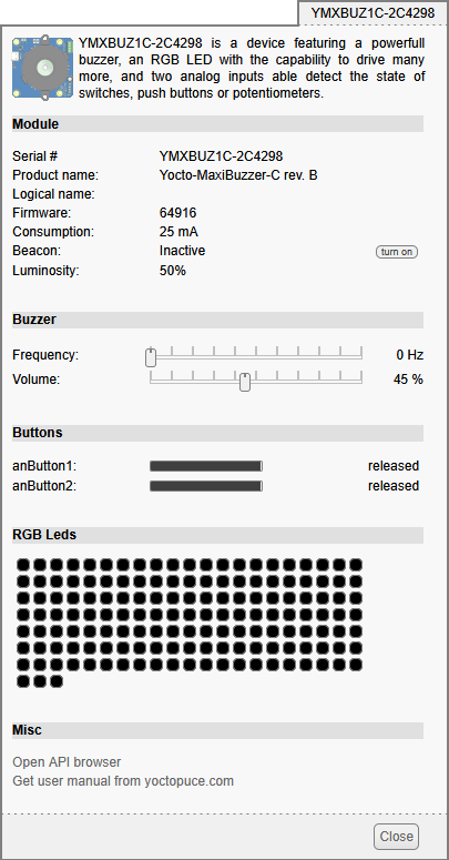 La première chose à vérifier est le bon fonctionnement de votre module: cliquez sur le numéro de série correspondant à votre module, et une fenêtre résumant les propriétés de votre Yocto-MaxiBuzzer-C.
