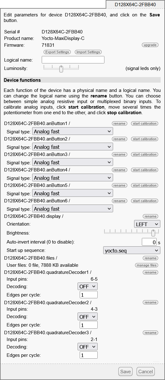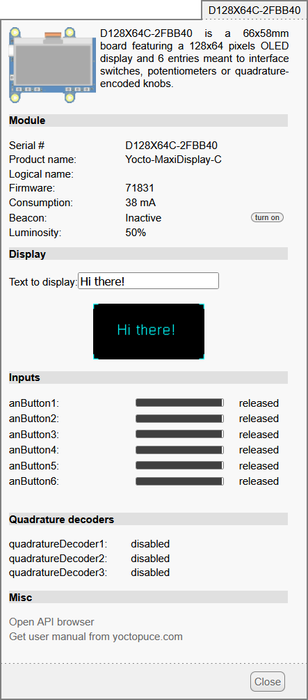 Chaque Yocto-module a un numéro de série unique attribué en usine, pour les modules Yocto-MaxiDisplay-C ce numéro commence par D128X64C. Le module peut être piloté par logiciel en utilisant ce numéro de série. Ce numéro de série ne peut pas être changé.