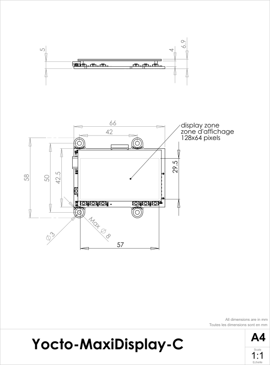 Le Yocto-MaxiDisplay-C est un module électronique de 66x58mm qui permet de piloter un écran OLED monochrome de 128 x 64px ainsi que 6 canaux qui permettant de mesurer l'état d'interrupteurs, boutons poussoir, ou encore de potentiomètres. Cet écran vous permettra d'afficher facilement quelques informations très lisibles depuis une machine qui n'est normalement pas munie d'un moniteur.