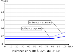 La précision absolue de la mesure d'humidité est typiquement de +/-1.5% entre 0% et 80% d'humidité (résolution de 0.01%), ou +/-2% jusqu'à 100% d'humidité. La tolérance maximale est documentée sur le graphique ci-dessous. La répétabilité est de 0.1 %RH.