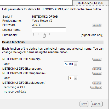 Le module Yocto-Meteo-V2 dispose de trois fonctions: "humidity", "temperature" et "pressure". Cliquez simplement sur le bouton "rename" correspondant pour leur affecter un nouveau nom logique.