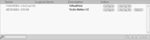 Il est alors possible de localiser physiquement chacun des modules affichés en cliquant sur le bouton beacon, cela a pour effet de mettre la Yocto-Led du module correspondant en mode "balise", elle se met alors à clignoter ce qui permet de la localiser facilement. Cela a aussi pour effet d'afficher une petite pastille bleue à l'écran. Vous obtiendrez le même comportement en appuyant sur le Yocto-bouton d'un module.