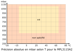 Le capteur MPL3115A25 est fabriqué par Freescale, Il permet de mesurer la pression atmosphérique de 200 à 1100 mbar6 avec une précision relative de 1mbar (précision absolue de 4mbar entre -10...70°C et 500...1100 mbar). La résolution est de 0.015mbar, ce qui correspond approximativement à une variation d'altitude de 15 cm.