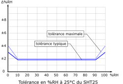 La précision absolue de la mesure d'humidité est de 1.8% entre 10% et 90% d'humidité (résolution de 0.1%). La tolérance maximale est documentée sur le graphique ci-dessous. La répétabilité est de 0.1 %RH.