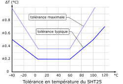 La précision absolue de la mesure de température elle-même est typiquement de +/-0.2°C entre 10°C et 60°C (résolution de 0.01°C), ou +/-0.4°C entre -30°C et 90°C. La tolérance maximale est documentée sur le graphique ci-dessous. La répétabilité est de 0.1°C.