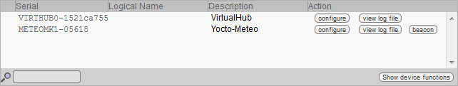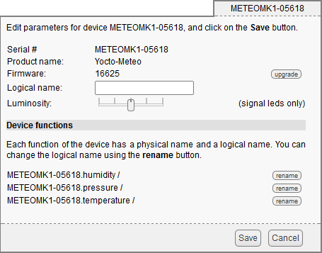 Le module Yocto-Meteo dispose de trois fonctions: "humidity", "temperature" et "pressure". Cliquez simplement sur le bouton "rename" correspondant pour leur affecter un nouveau nom logique.