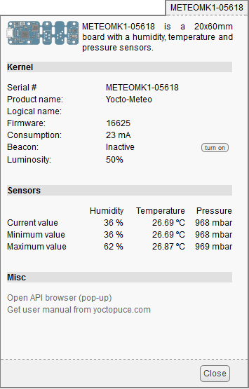 La première chose à vérifier est le bon fonctionnement de votre module: cliquez sur le numéro de série correspondant à votre module, et une fenêtre résumant les propriétés de votre Yocto-Meteo.