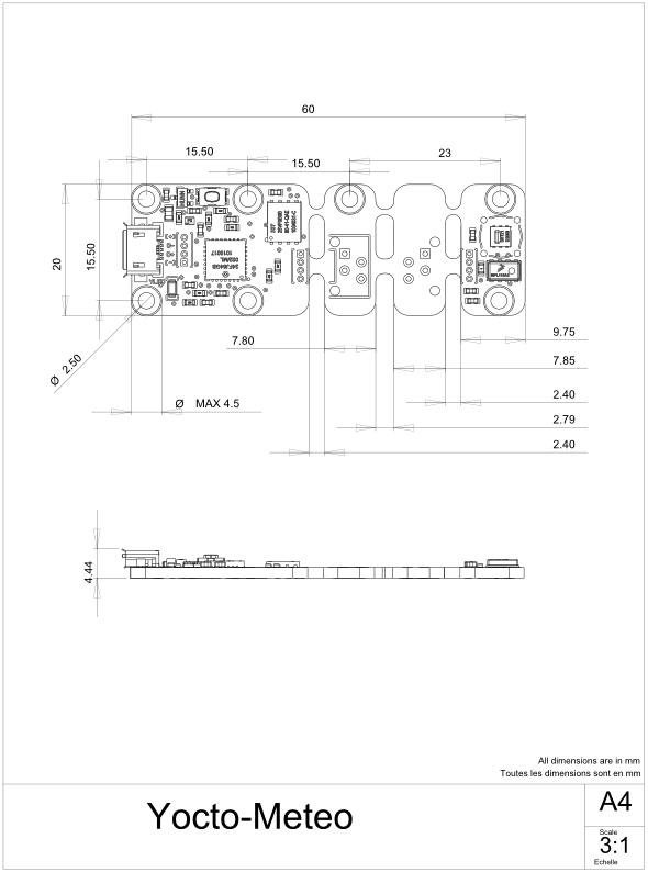 Le Yocto-Meteo est un module électronique de 60x20mm qui permet de mesurer par USB à la fois la température, le taux d'humidité relative et pression atmosphérique. Sa précision typique est de 0.2°C pour la température, d'environ 1.8% pour le taux d'humidité et de 1mbar pour la pression .