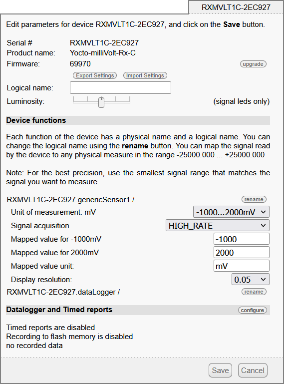 Le module Yocto-milliVolt-Rx-C fournit la fonction "genericSensor" qui correspond au canal d'entrée. Cliquez simplement sur le bouton "rename" correspondant pour lui affecter un nouveau nom logique.