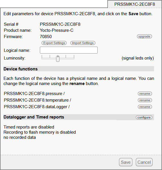 Les deux seules fonction fournies par le module Yocto-Pressure-C sont les fonctions "pressure" et "temperature". Cliquez simplement sur le bouton "rename" correspondant pour leur affecter un nouveau nom logique.