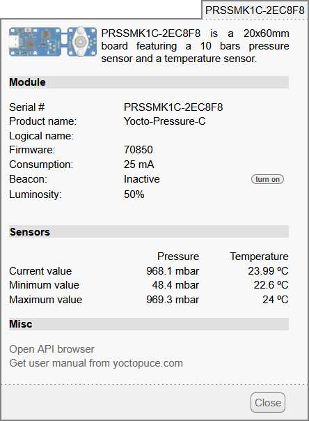 La première chose à vérifier est le bon fonctionnement de votre module: cliquez sur le numéro de série correspondant à votre module, et une fenêtre résumant les propriétés de votre Yocto-Pressure-C.