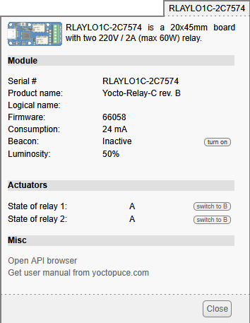La première chose à vérifier est le bon fonctionnement de votre module: cliquez sur le numéro de série correspondant à votre module, et une fenêtre résumant les propriétés de votre Yocto-Relay-C.