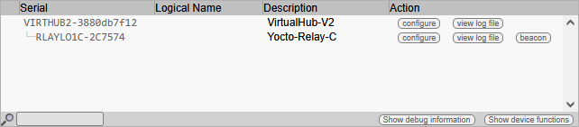 Il est alors possible de localiser physiquement chacun des modules affichés en cliquant sur le bouton beacon, cela a pour effet de mettre la Yocto-Led du module correspondant en mode "balise", elle se met alors à clignoter ce qui permet de la localiser facilement. Cela a aussi pour effet d'afficher une petite pastille bleue à l'écran. Vous obtiendrez le même comportement en appuyant sur le Yocto-bouton d'un module.
