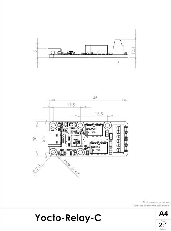Le module Yocto-Relay-C est un petit module de 45x20mm qui permet de commander des petits relais par USB. Ce relais peut commuter jusqu'à 60V DC et 2A, max 60W, ce qui permettra de commander des petits appareils basse tension en agissant directement sur leur alimentation, ou en simulant la pression d'interrupteurs. Les petites dimensions du module lui permettent d'être glissé pratiquement n'importe où, y compris à l'intérieur des appareils à commander.