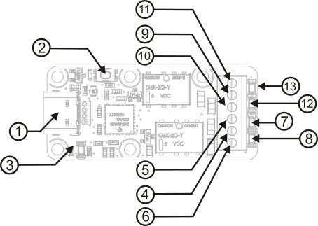 | 3: | Yocto-LED | 6: | Sortie B du relais 1 | 11: | Sortie B du relais 2 |