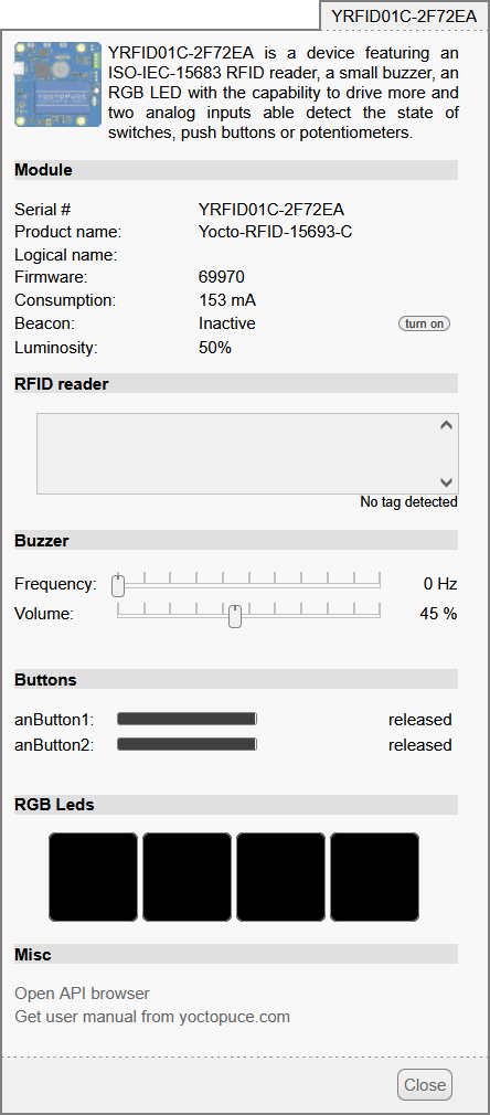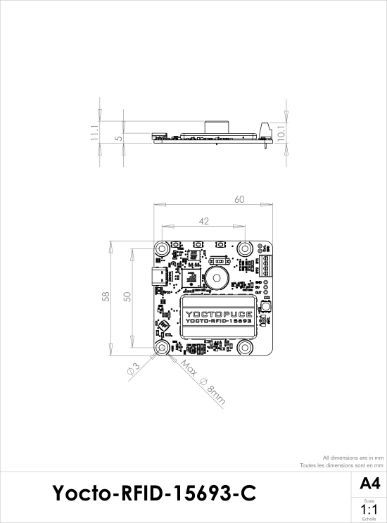 Le Yocto-RFID-15693-C est un module électronique de 60x58mm qui permet de détecter des tags RFID au standard ISO-15693 (13.56MHz), et de lire et écrire les données sur ces tags. Il offre en plus des entrées pour deux boutons-poussoir ou potentiomètres, un petit buzzer et une LED RGB avec la possibilité d'en piloter plus. Ce module a été conçu pour offrir un moyen simple et compact pour construire une interface utilisateur basée RFID. Attention, le Yocto-RFID-15693-C ne fonctionne PAS avec les tags MIFARE, qui répondent au standard ISO-14443A.