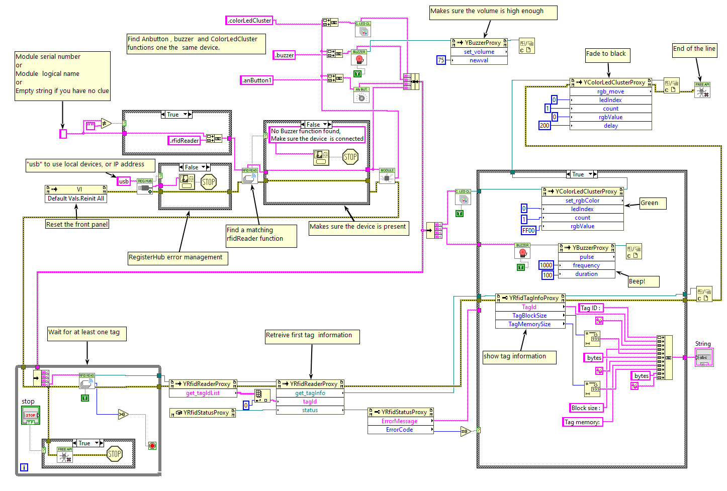 Les fonctions YRfidReader.tagReadBin() / tagReadArray() / tagReadStr() / tagReadHex() sont le pendant des fonctions d'écriture. Elles permettent de lire une quantité arbitraire de données depuis un tag. Elles gèrent automatiquement la taille des différents blocs et le ré-assemblage des données tout en sautant les blocs spéciaux. Ces fonctions peuvent être utilisées pour lire les blocs spéciaux en modifiant le paramètre options.
