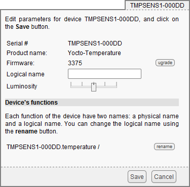 La seule fonction fournie par le module Yocto-Temperature est la fonction "temperature". Cliquez simplement sur le bouton "rename" correspondant pour lui affecter un nouveau nom logique.