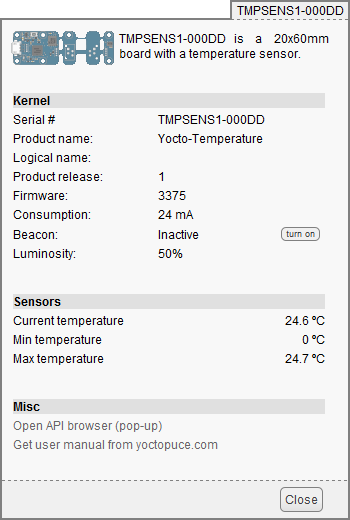 La première chose à vérifier est le bon fonctionnement de votre module: cliquez sur le numéro de série correspondant à votre module, et une fenêtre résumant les propriétés de votre Yocto-Temperature.