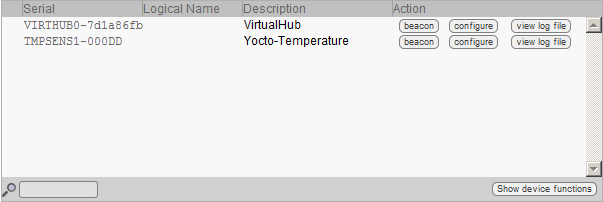 Il est alors possible de localiser physiquement chacun des modules affichés en cliquant sur le bouton beacon, cela a pour effet de mettre la Yocto-Led du module correspondant en mode "balise", elle se met alors à clignoter ce qui permet de la localiser facilement. Cela a aussi pour effet d'afficher une petite pastille bleue à l'écran. Vous obtiendrez le même comportement en appuyant sur le Yocto-bouton d'un module.