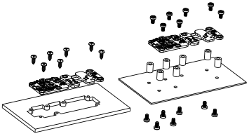 Pour fixer le module Yocto-Temperature à un support, vous pouvez placer des petites vis de 2.5mm avec une tête de 4.5mm au maximum dans les trous prévus ad-hoc. Il est conseillé de les visser dans des entretoises filetées, que vous pourrez fixer sur le support. Vous trouverez plus de détail à ce sujet dans le chapitre concernant le montage et la connectique.