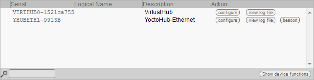Le deuxième bouton, Show device functions, montre toutes les fonctions du YoctoHub-Ethernet et de chacun des modules connectés au YoctoHub-Ethernet.