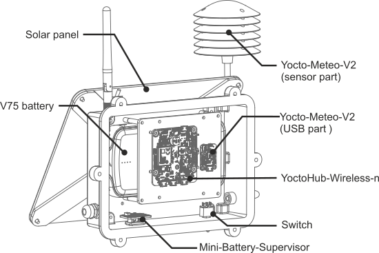 The YoctoHub-Wireless-n inside the box has been configured to wake up every 5 minutes, connect to a VirtualHub (for web), send its data, and go back to sleep. You can find out how to do this in another post on this blog. Based on our V75 battery tests, the system should consume around 50mW. Even without sunlight, the 71Wh battery should be able to power the system for a good fifty days, so we imagine that with our 6W solar panel and a little sunlight, our new weather station should be able to operate indefinitely.