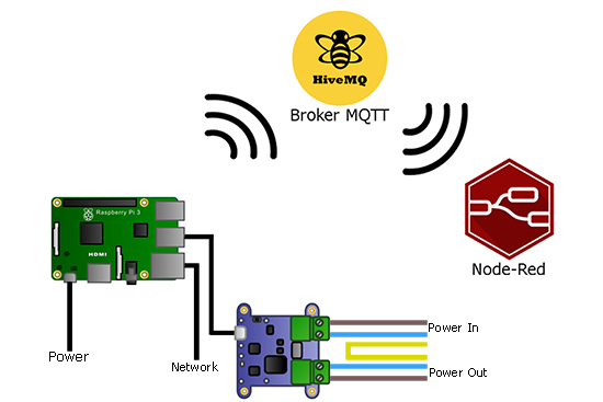 For this system, we use a Yocto-Watt connected serially to a an extension cord which is the only power source for the whole workbench. The idea of the system is to measure electric power thanks to the Yocto-Watt, then to treat these measures in a Python script, and to send them to a web server for display, in the present case Node-RED. All messaging is done through the MQTT protocol.