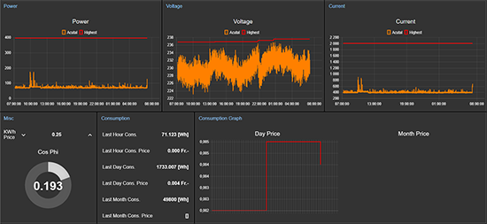 The Python script computes the power consumption per hour, per day, but also per month. Now that we have all these consumption data, we can compute the cost of all this. Knowing that the number of consumed KW/h and its unit price, which is between 0.15 and 0.3 cts/KW/h in Switzerland, we can compute the price. On the following screen shot, you can see the computed costs: