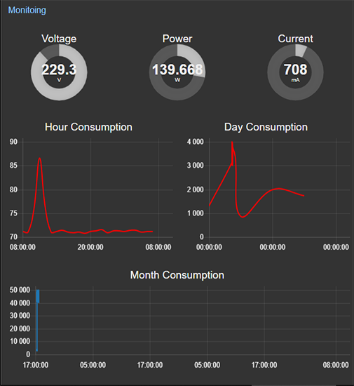 In the "Consumption" column, you can see the consumption per hour, per day, and per month, but also the operating cost. The operating cost per hour is almost null as the consumption is very low on this time range. The lower right graph is empty because the system has not been working for long enough to compute a whole month of consumption. You can set the KW/h price in the "Misc" column, just above the phase shift.