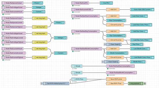 Here is what the programming flow looks like in Node-RED. You can see in purple the MQTT nodes, and in blue the display nodes. Purple nodes are thus nodes which receive messages from the MQTT broker. From there, the data are sent to a display node (gauge, graph, text). Finally, orange nodes are customized functions which serve to code specific functions in JavaScript.
