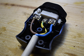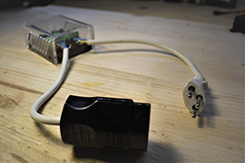 We can now make the extension cord of which the Yocto-Watt is going to be part. We take two high voltage cables, we add a mains socket and a mains plug, and that's it.
