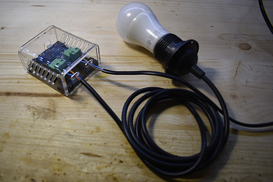 To begin, in order to test our Python script before we build the complete system, we build a first temporary system with a single plug, a base, and a led bulb: