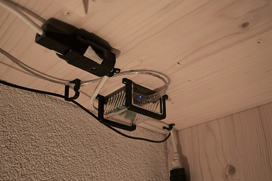 We move a piece of furniture and a few boxes to access to the extension cord to cut it and to add to it a plug and a socket.