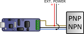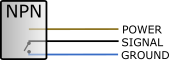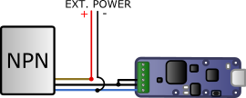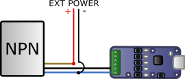 The Yocto-Knob is a cheap solution, which works with NPN outputs but not with PNP ones. There as well, you need an external power supply. To connect an NPN sensor to a Yocto-Knob, you need: