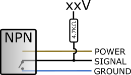The advantage of NPN outputs is the possibility to choose an arbitrary signal voltage. Note that an NPN output works in the opposite way to a PNP output: signal goes to zero when the sensor is active.
