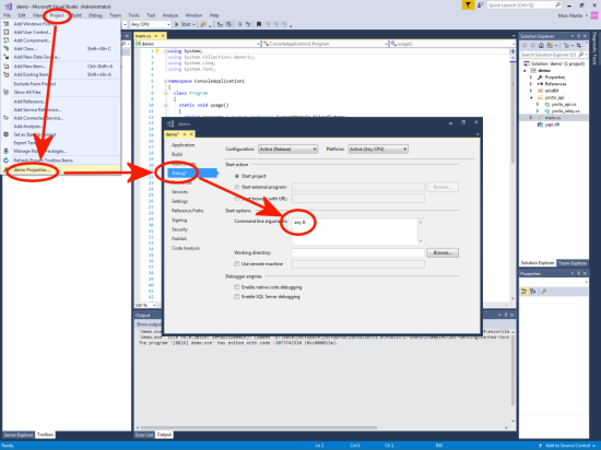 Go to Project/ Properties / Debug and fill in the field "Command line arguments".