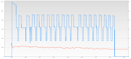 The objective of this test bench is to check the actual autonomy of different bike lights. We used a Yocto-Light-V3 placed 50 cm in front of the light. By placing this system in a poorly lit place, such as a cellar, we can very easily detect when the lamp is on or off. As the Yocto-Light-V3 has a large enough measuring range, it is not saturated by the light and we can even compare the power of different lights. The absolute measure is not very relevant, because optics and beam shape are more important in real use, but it is always interesting to be able to compare the raw power of the different lights.