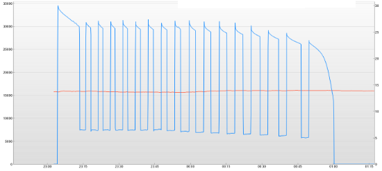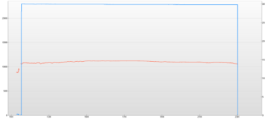 The purpose of this test bench is to obtain a graph with the Lux measured by the Yocto-Light-V3 on the Y axis and the time on the X axis. We also display the ambient temperature on a secondary axis. This graph allows us to determine afterwards the real autonomy of the light.