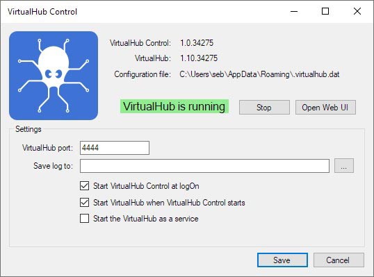 This window also allows you to configure the startup options of the VirtualHub. You can select the port used by the VirtualHub, as well as the location of the log files. You can also configure the VirtualHub so that it works as a Windows service.