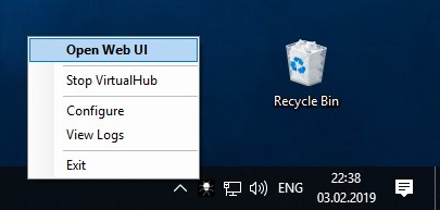 A simple click on the icon displays a menu with the available operations, while a double-click displays the VirtualHub web interface in the default web browser.