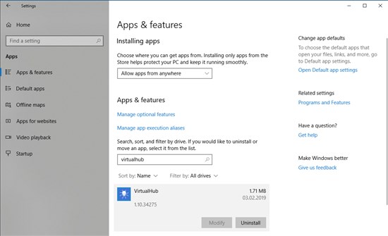 Thanks to the installer, the VirtualHub is recognized as a fully fledged Windows program. This means that you can obtain the version of the VirtualHub and uninstall it directly from the Windows configuration panel: