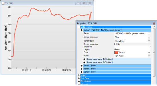 Interfacing an I2C sensor is not always easy, but using the Yocto-I2C allows you, when you have written the corresponding job, to read the values of an I2C sensor as easily as if it were a native Yoctopuce sensor. The proof: here are the measures of the TSL2591 displayed directly in Yocto-Visualisation.