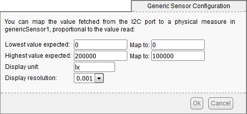 With this job, you get the measured valued stored in genericSensor1 of the Yocto-I2C. Unfortunately, this value in given in count and not in lux. The TSL2591 datasheet only suggests to use an "empirical formula" to make the conversion. By comparing with a calibrated luxmeter, we noticed that for measures performed at 10Hz, we only needed to divide the number of counts by two to obtain values similar to those of the luxmeter. Rather than hard coding this division in the protocol, we preferred storing it in the GenericSensor1 mapping.