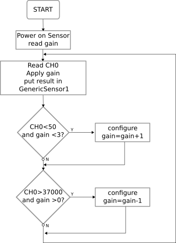 The business end the job are the last three lines of the "read" task: we have read the CH0 register which we multiply by the factor corresponding to the current gain, divided by 1000 to avoid an overflow, and we assign the result to the genericSensor1 of the Yocto-I2C. If the value of channel CH0 is smaller than 50 or greater than 37000, we decide to correct the gain by computing a new value of $state, which triggers the execution of the corresponding setGainToX task. Note that after changing the gain, we wait for 200ms, as we noticed that changing the gain distorts the value of the current measure. You can note that there is a setGainToX per gain value, because the Yocto-I2C jobs do not allows variable use in I2C transfers.