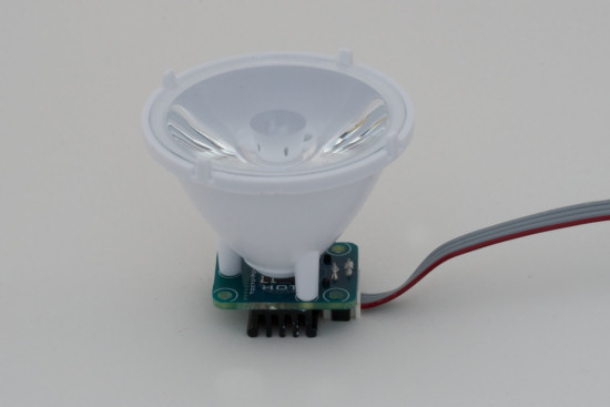 The Yocto-PowerColor is the big brother of the RGB led module Yocto-Color which you already know, but... much more powerful. Using in an optimal way all the current available by USB (500mA), this module provides up to 2.3W to a powerful color led, precisely regulating the current to compensate for variations due to the heat. The module is equipped with a small radiator which helps to dissipate the heat in excess when working at full power. Caution, do not look directly at this led, it would hurt your eyes... You can fix on this module a reflector which you can buy separately, at Farnell for example.