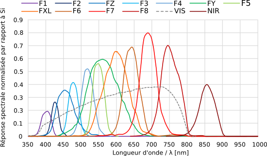 The Yocto-Spectral incorporates a spectral sensor from AMS Osram, the AS7343. This sensor measures light intensity over 13 channels covering the visible and near-infrared spectrum, between 400 and 850 nm.