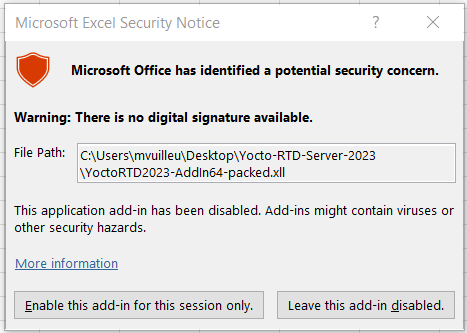2. Use the menu File, Open to open the YoctoRTD2023-AddIn64-packed.dll file that you have extracted from the archive. Excel then tells you that the add-in is not signed: